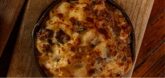 Tender sliced beef, roasted crimini mushrooms, caramelized onions, beef au jus, provolone cheese, sour cream and mixed with our creamy Mac n’ Cheese.